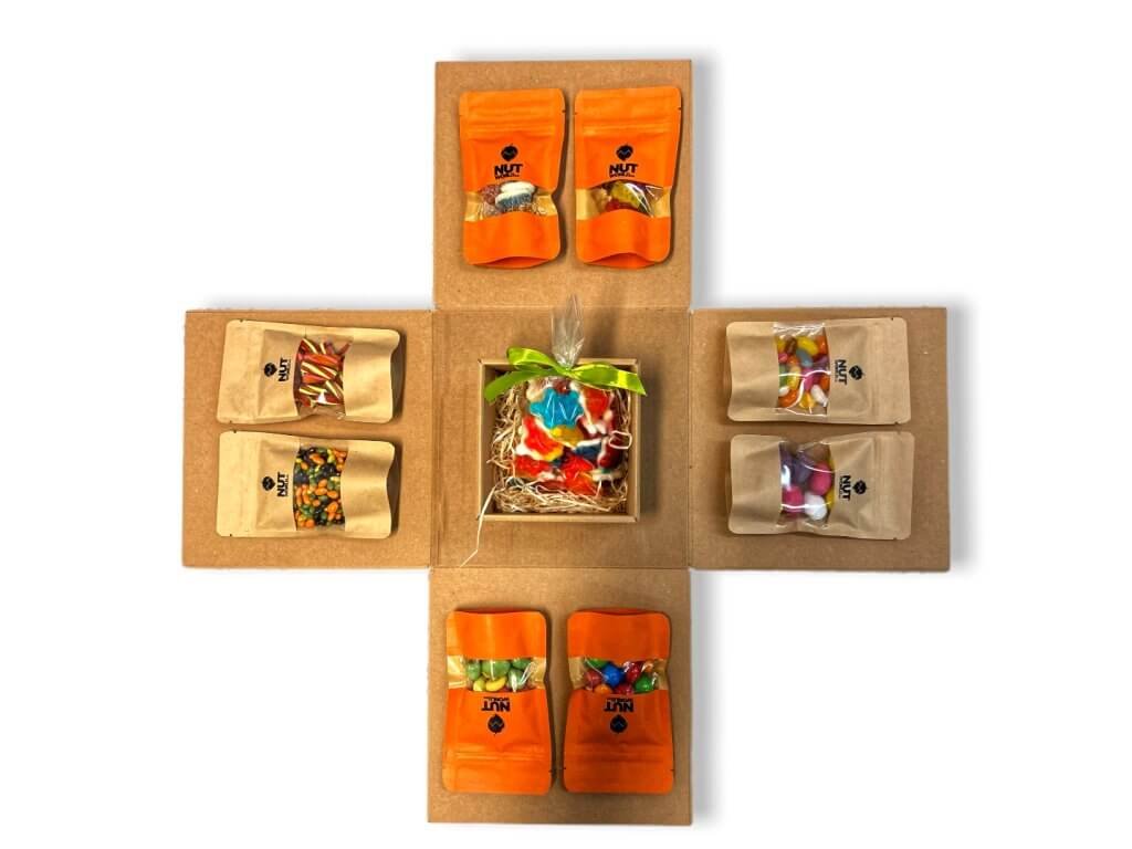 - 50g Slunečnice v barevné krustě: cukr, slunečnicová semínka, hydrogenovaný palmojádrový olej, kakaový prášek, maltodextrin, zahušťovadlo (E414), barvivo (E170, E153), emulgátor (E322) SÓJOVÝ lecitin, Barvivo (E160c, E140), Leštící látka (E903), Barvivo (E100), Aroma