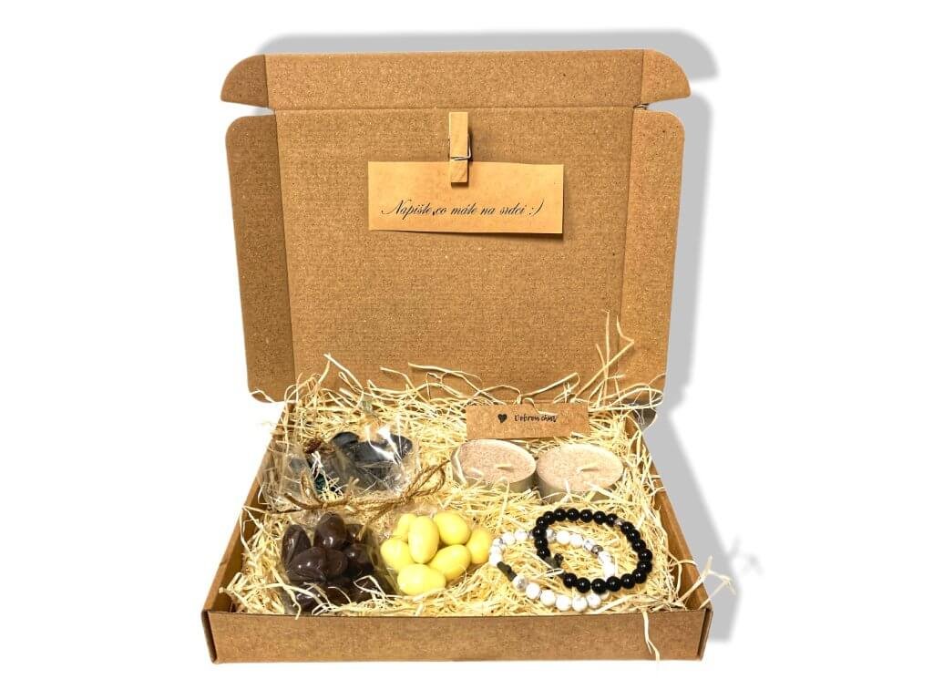 Kolíček s vlastním textem. 2x 50g ořechů mandle v hořké čokoládě a mandle uzené. Svíčka maxi čajová Indian Silk. Vše je zapečetěno.