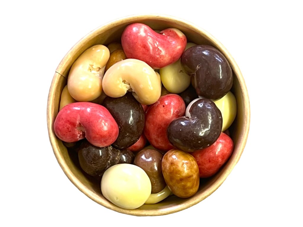 Kešu v jogurtu Složení: KEŠU ořechy 33%, jogurtová poleva 67% (cukr, rostlinný tuk palmový, SYROVÁTKA (MLÉKO), rýžová mouka, JOGURTOVÝ pudr (MLÉKO) 3%, emulgátor: slunečnicový lecitin, leštidla: arabská guma, šelak). Země původu: Velká Británie Kešu v hořké čokoládě Složení: hořká čokoláda 72% (cukr, kakaová hmota, kakaové máslo, SÓJOVÝ lecitin, přírodní vanilkové aroma), KEŠU jádra 28%, leštidlo: arabská guma. Země původu: Holandsko Kešu tiramisu Složení: tiramisu poleva 69% (cukr, rostlinný olej palmový, SYROVÁTKA (MLÉKO), rýžová mouka, řepkový lecitin, arabská guma, šelak, příchuť tiramisu, hořká čokoláda 0,1%), KEŠU ořechy 31%. Země původu: Velká Británie Kešu v karobu Složení: karobová poleva 67% (cukr, rostlinný tuk palmový, SYROVÁTKA (MLÉKO), pudr ze svatojánského chleba 6%, rýžová mouka, emulgátor: slunečnicový lecitin), KEŠU jádra 33%, leštící látka: arabská guma, šelak. Země původu: Velká Británie Kešu v mléčné čokoládě Složení: mléčná čokoláda 75% (cukr, sušené plnotučné MLÉKO, kakaová hmota, kakaové máslo, sušená SYROVÁTKA (MLÉKO), LAKTÓZA, SOJOVÝ lecitin, přírodní vanilkové aroma), KEŠU jádra 25%, leštící látka: arabská guma. Země původu: Holandsko Kešu v karamelu Složení: poleva s karamelovou příchutí 67% (cukr, rostlinný tuk palmový, SYROVÁTKA (MLÉKO), rýžová mouka, emulgátor slunečnicový lecitin, leštidla: arabská guma, šelak, karamelové barvivo E150a, karamelová příchuť), KEŠU ořechy 33% Země původu: Velká Británie Kešu v bílé čokoládě Složení: KEŠU jádra 28%, bílá čokoláda 72% (cukr, kakaové máslo, sušené plnotučné MLÉKO, LAKTÓZA, sušené odstředěné MLÉKO, SOJOVÝ lecitin, přírodní vanilkové aroma), leštící látka: arabská guma. Země původu: Holandsko Kešu MALINOVÉ v bílé čokoládě Složení: bílá čokoláda73% (cukr, kakaové máslo, sušené plnotučné MLÉKO, LAKTÓZA, sušené odstředěné MLÉKO, SOJOVÝ lecitin, přírodní vanilkové aroma), KEŠU jádra 25%, lyofilizované maliny 2%, leštící látka: arabská guma. Země původu: Holandsko |