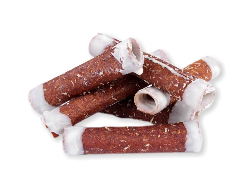 jablečná dřeň 79%, KOKOS 1%, jogurtová poleva 20% (cukr, rostlinný tuk RSPO-MB (palmojádrový, palmový a shea), sušené MLÉKO a SYROVÁTKA, sušený JOGURT (MLÉKO) 1,6%, kyselina citronová, emulgátor: SOJOVÝ lecitin, aroma, jedlá sůl).