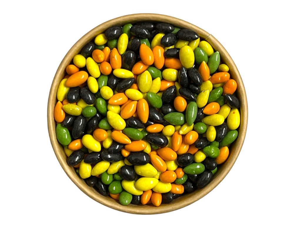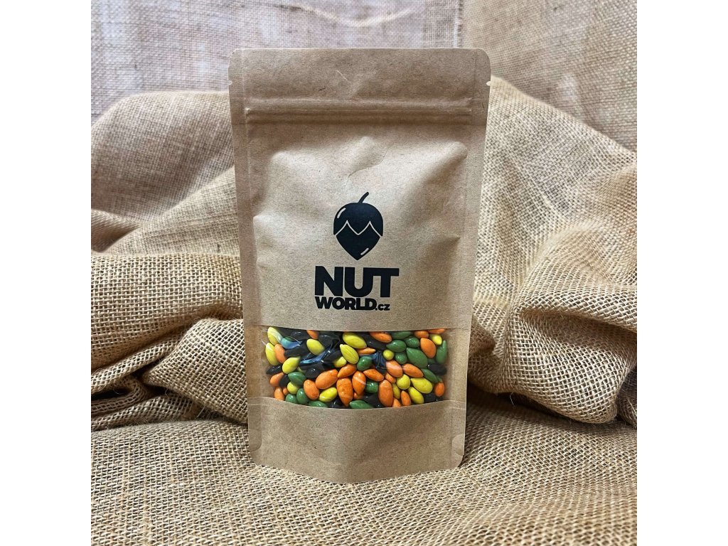 Složení: Poľavované slnečnicové semienka s čokoládovou príchuťou - cukor, slnečnicové semienka, hydrogenovaný palmojadrový olej, kakaový prášok, maltodextrín, zahusťovadlo (E414), farbivo (E170, E153), emulgátor (E322) SÓJOVÝ lecitin, farbivo (E160c, E140), Leštiaca látka (E903), Farbivo (E100), Aróma